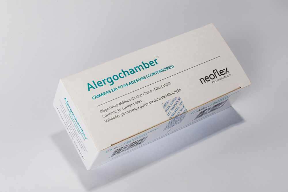 O produto Patch Test Alergochamber 8 mm - Contensores e Fitas Adesivas Montados em fita adesiva é apresentado em Caixa lacrada com 30 unidades de contensores (câmaras montadas em fita adesiva) de 8 mm, 3 réguas de poliestireno branca com 10 recortes, 1 saquinho contendo em média 96 unidades de filtro branco e 1 instrução de uso.