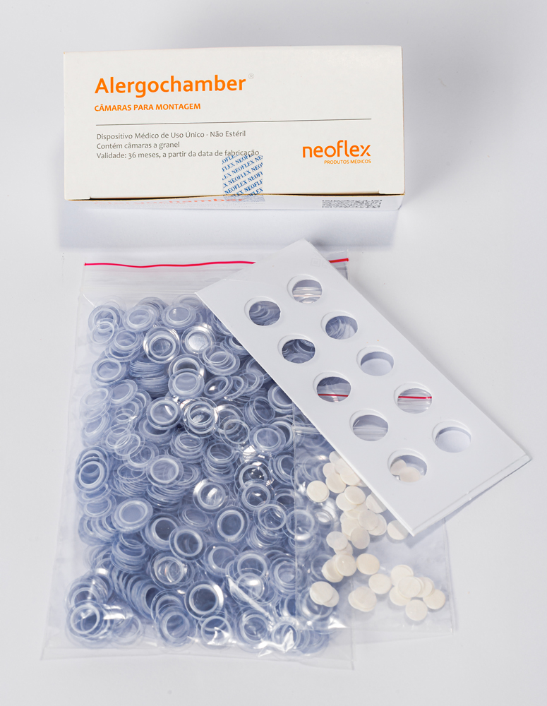 Alergochamber são câmaras são utilizadas única e exclusivamente para a colocação de alérgenos em suas cavidades para os testes de contato (epicutâneos). As câmaras têm formato circular medindo 8 mm de diâmetro interno, apresentando bordas elevadas para formar uma cavidade com capacidade para 35 µL. As câmaras são apresentadas isoladas para serem aderidas a fitas adesivas hipoalergênicas e utilizadas em pacientes com suspeita de alergia de contato. As câmaras são de material plástico (polímero de policloreto de vinila), inerte e atóxico, que não causa reação irritativa e não reage com as substâncias alergênicas. É um produto descartável para uso médico-hospitalar.